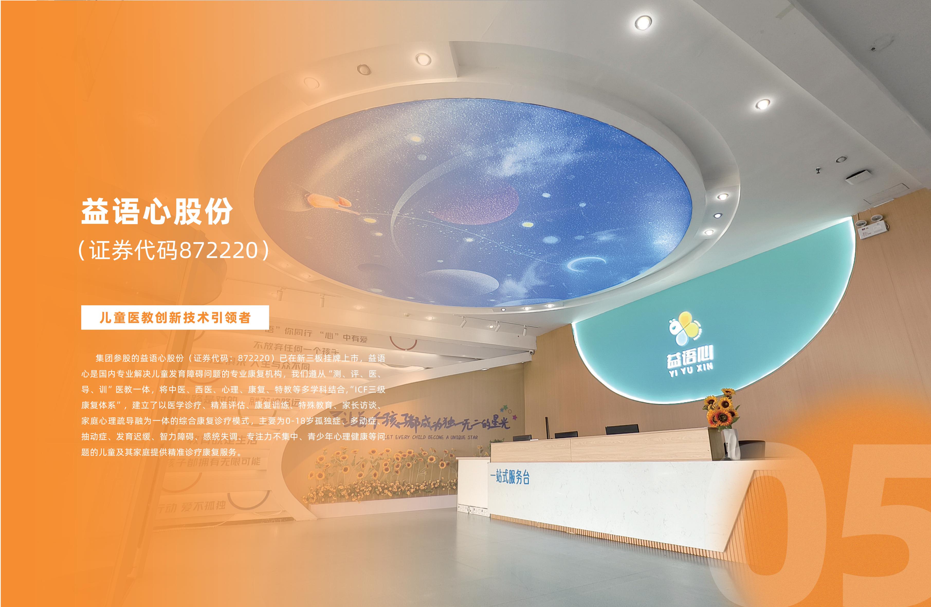J9旗舰厅控股集團(tuán)有限公司(簡(jiǎn)稱“J9旗舰厅控股集團(tuán)”)始建于2017年11月,集團(tuán)總部位于山東泰安,總建筑面積七萬余平,現(xiàn)有員工700余人,是一家集醫(yī)、康、養(yǎng)、產(chǎn)、學(xué)、研于一體的綜合性健康產(chǎn)業(yè)集團(tuán)公司。集團(tuán)下設(shè)成康、醫(yī)康養(yǎng)、醫(yī)療科技、教育等事業(yè)部,通過“立足本土、放眼全球”的戰(zhàn)略布局,構(gòu)建起多維度的心理康復(fù)服務(wù)體系。 集團(tuán)參股的益語心股份(證券代碼:872220)已在新三板掛牌上市,益語心是國(guó)內(nèi)專業(yè)解決兒童發(fā)育障礙問題的專業(yè)康復(fù)機(jī)構(gòu),我們遵從“測(cè)、評(píng)、醫(yī)、導(dǎo)、訓(xùn)”醫(yī)教一體,將中醫(yī)、西醫(yī)、心理、康復(fù)、特教等多學(xué)科結(jié)合,“ICF三級(jí)康復(fù)體系”,建立了以醫(yī)學(xué)診療、精準(zhǔn)評(píng)估、康復(fù)訓(xùn)練、特殊教育、家長(zhǎng)訪談、家庭心理疏導(dǎo)融為一體的綜合康復(fù)診療模式,主要為0-18歲孤獨(dú)癥、多動(dòng)癥、抽動(dòng)癥、發(fā)育遲緩、智力障礙、感統(tǒng)失調(diào)、專注力不集中、青少年心理健康等問題的兒童及其家庭提供精準(zhǔn)診療康復(fù)服務(wù)。目前業(yè)務(wù)已經(jīng)拓展到浙江、江蘇、廣東等地。
